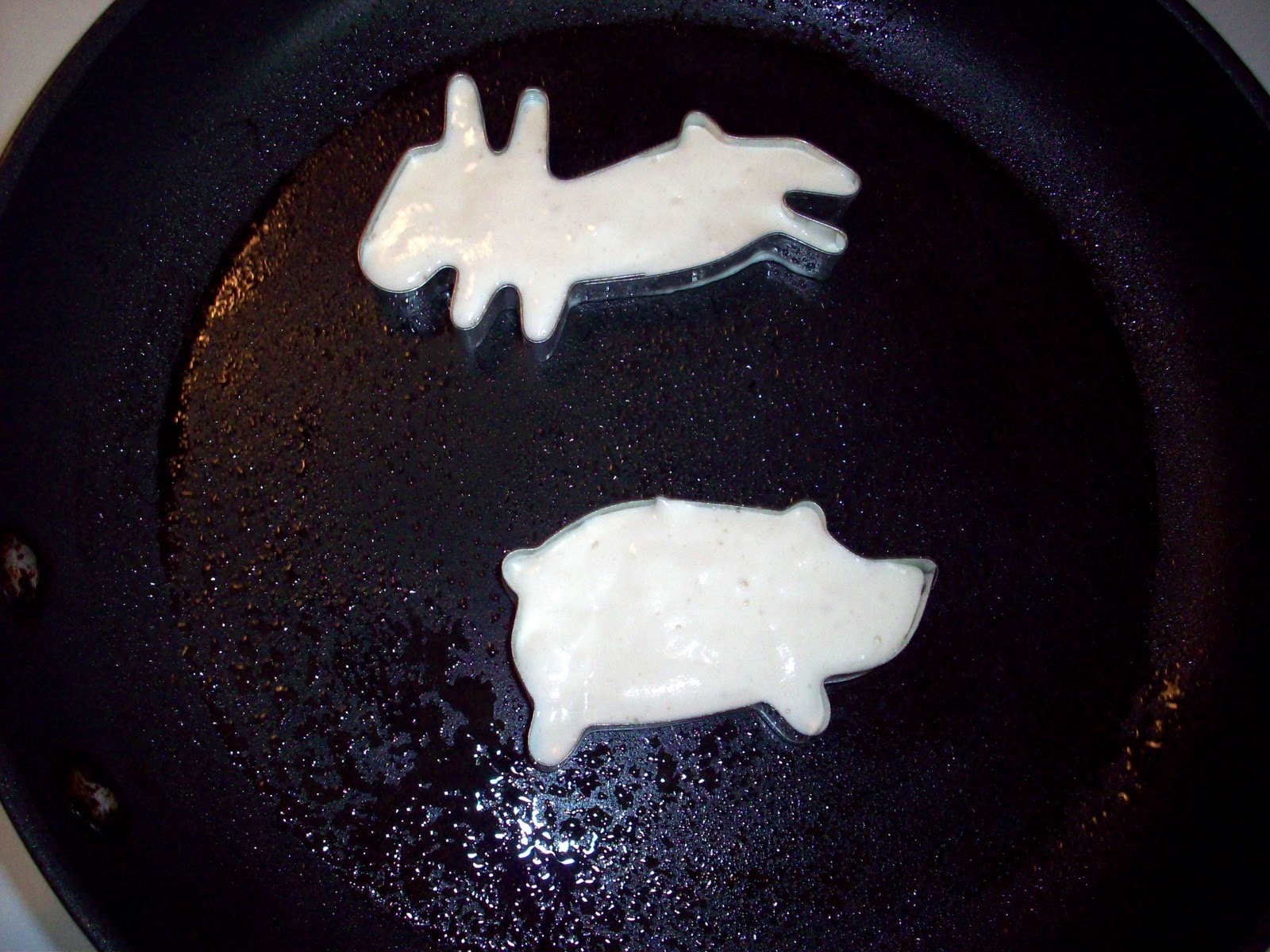 I always do pancakes in shapes for the kids. I will freehand cut them or use various sized circles to build animals by putting circles together. You can also put batter in a squirt bottle and squirt it out to make letters or thin lines for building animals :)